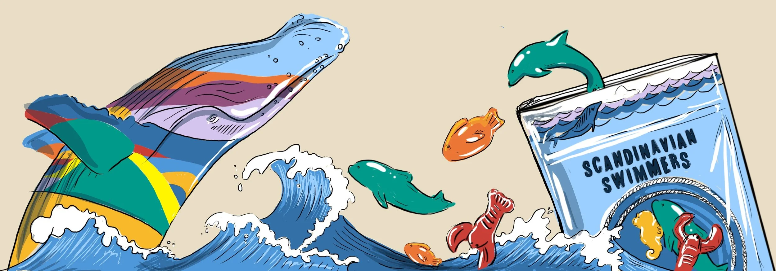 For this mural, I reimagined one of Sugar House’s most recognizable icons—the Sugar House Whale—as part of a playful, unexpected world where it swims alongside Trader Joe's Scandinavian Swimmers. Using bold, confident line work and a vibrant yet carefully controlled color palette, I blended the charm of local culture with Trader Joe’s signature whimsy. The result is a piece that feels both familiar and delightfully surprising—celebrating community identity while adding a splash of humor and imagination to the space.